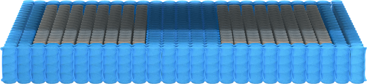 The mattress comprises three layers of different foams, including a top layer with phase-changing ArcticTex fibers, ensuring pressure relief and spinal alignment. The eight-inch pocket coil system underneath enhances breathability, with thicker coils strategically placed around the perimeter and central third for reinforced support. A recycled plant fiber foundation layer further strengthens the mattress’s overall support.